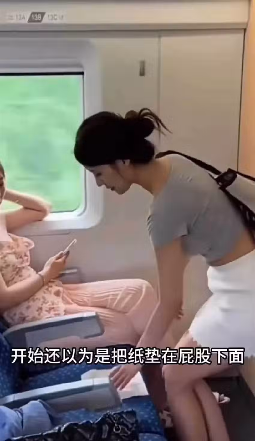 一位年輕女子上車後,先是找好座位,四周觀察了一下,隨即從包里掏出一張衛生紙,小心翼翼地鋪在座位上。