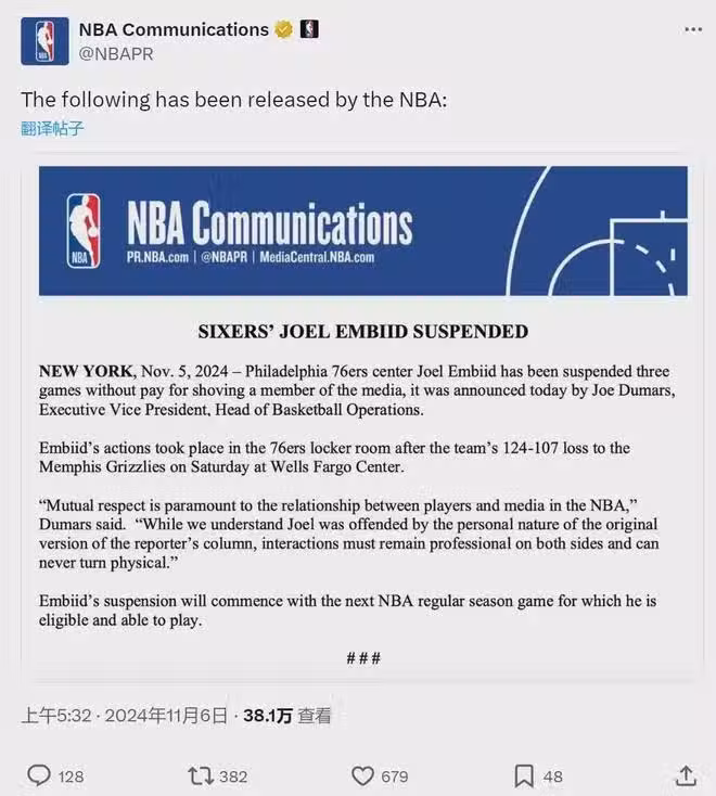 11月6日上午,NBA官方宣布:因推搡一名媒體人員,76人球員恩比德被禁賽3場。因為此次禁賽,恩比德損失106萬3778美元。推搡一次損失上百萬美元,怎麼看都不划算。問題來了:恩比德禁賽時間從啥時候開始算?