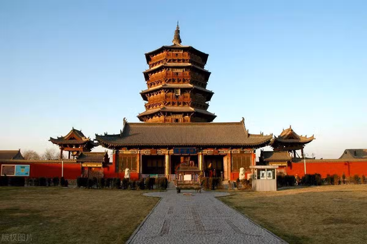 全塔高67.13米,直徑30.48米,呈八角形,共五層,結構精巧,造型莊重。塔內分為兩層,每層都有八個屋檐和八個角梁,每個角樑上都有一個銅鈴,風吹過時,銅鈴會發出清脆的聲音,給這座古老的木塔增添了無限生機。