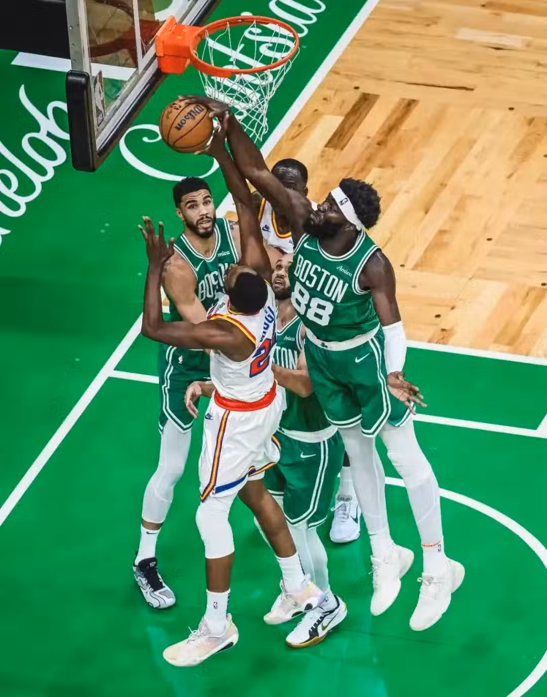 勇士首發:庫里、穆迪、維金斯、追夢、TJD。由於杰倫-布朗缺陣,勇士可以放心夾擊塔圖姆。兩隊命中率都很低,開場打了2分半鐘,比分只是2比0。接下來懷特三分三連擊,綠軍領先到兩位數。希爾德替補上場,首節3中3得8分!