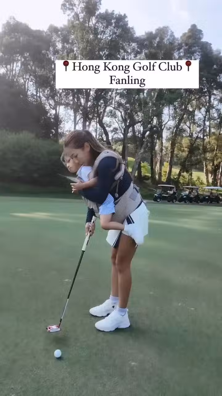 何雁詩帶娃打高爾夫!背2歲罕見病兒子在胸前揮桿,盡展堅韌母愛