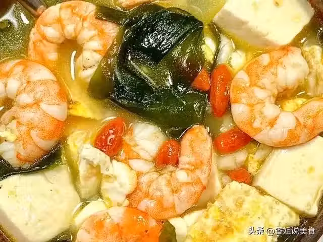 準備食材:蝦仁,豆腐,裙帶菜,雞蛋,枸杞子。