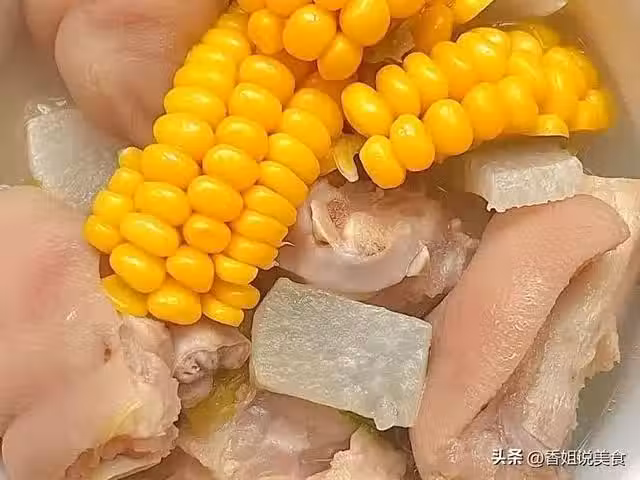 4、接著再放入玉米、白蘿蔔,繼續燉煮半個小時。最後加入食鹽調味,再煮五分鐘煮入味即可出鍋。