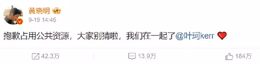 黃曉明9月大方認愛葉珂。(圖/微博 黃曉明)