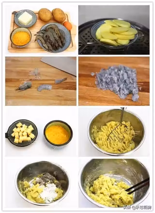第七步:將剁好的蝦肉放入土豆泥中,再放入2勺玉米澱粉、1勺鹽、少許黑胡椒碎,如圖。