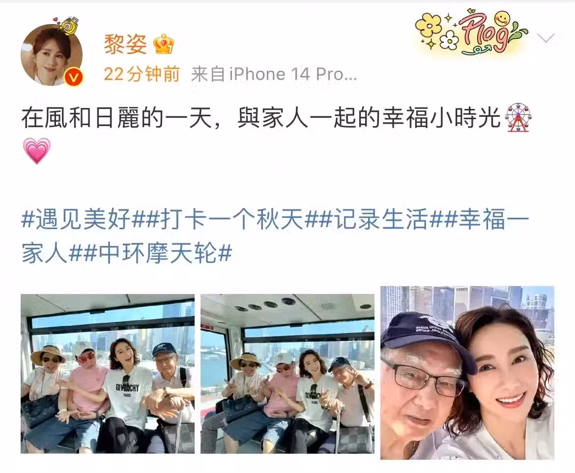 11月9日,黎姿在社交平台曬出帶著父母以及弟弟出遊搭摩天輪的照片,一家四口看起來好溫馨。黎姿配文「在風和日麗的一天,與家人一起的幸福小時光」。