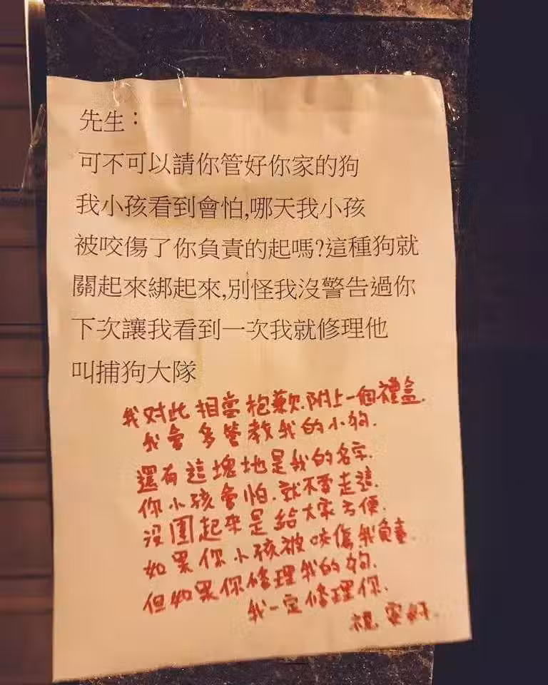 日前在網絡上貼出一篇文,一名網友表示自己的家門口被貼了一張紙條,上面寫著:「先生,可不可以管好你家的狗?我小孩看到會怕,哪天我小孩被咬傷了你負責的起嗎?這種狗就關起來綁起來!別怪我沒警告過你,下次再讓我看到一次我就修理它!叫捕狗大隊!」