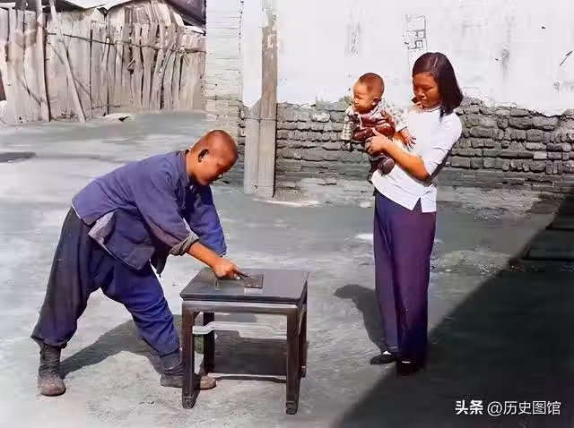 民國時期,一名木匠正在製作一張方桌。他正用批灰刀往桌抹膩子。膩子乾了之後再在上面刷油漆。妻子抱著孩子站在旁邊,看著丈夫幹活。在過去,木匠很吃香。他們能製作各種家具,獲得的收入也不菲。