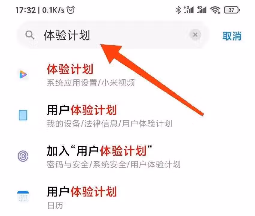 打開手機的設置頁面,然後搜索「體驗計劃」就會出現手機中所有的用戶體驗計劃選項,包括手機系統的體驗計劃以及系統自帶APP中的體驗計劃。