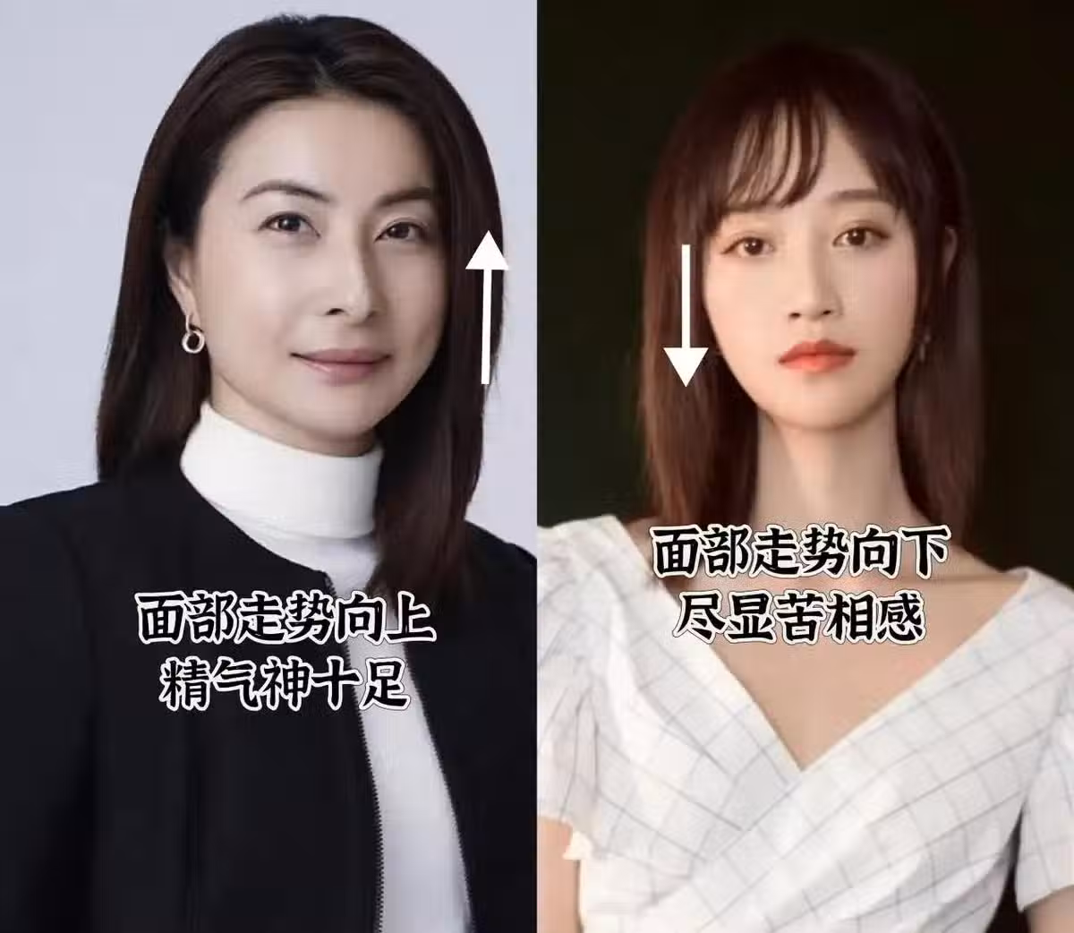 面部走勢向上最大的優勢,就是具備抗老能力,就算到了40歲以後,也依舊皮膚緊緻不松垮,皺紋也不會很明顯,相反,面部走勢向下的女人,往往更加苦相,而且會有刻薄感。