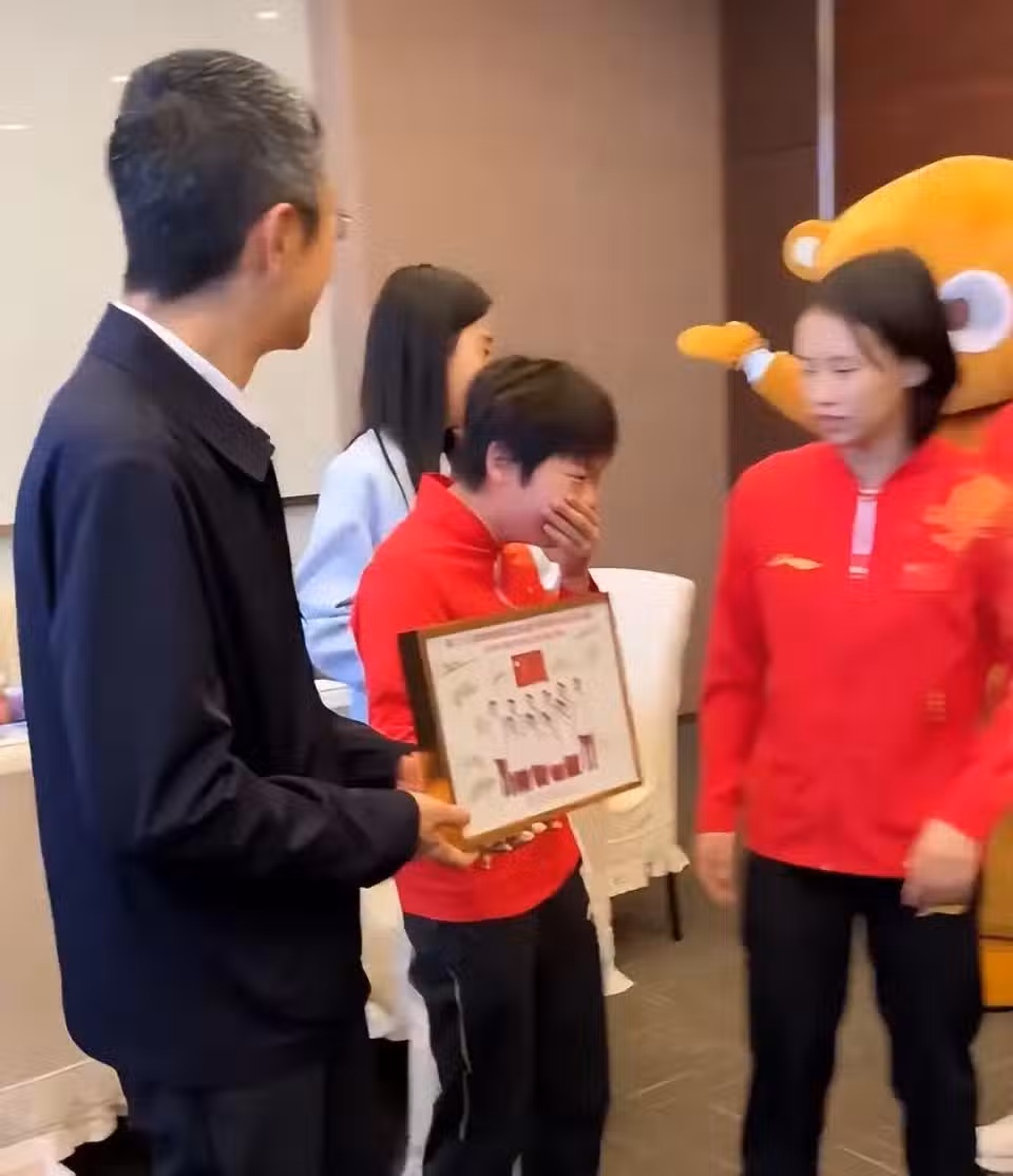 反應過來的全紅嬋將禮物送往領導,她燦笑捂嘴也太可愛了吧。