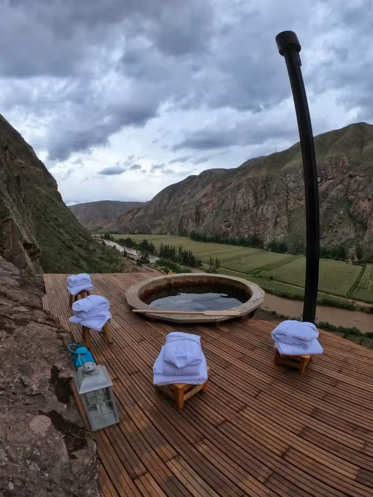 此外,一塊特殊木甲板還嵌在了附近的一處懸崖山脊處,上面建有一組熱水浴缸。
