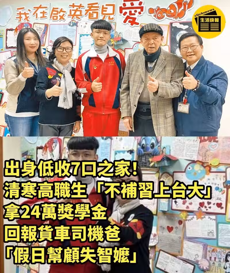 出身低收7口之家!清寒高職生「不補習上台大」 拿24萬獎學金 回報貨車司機爸「假日幫顧失智嬤」