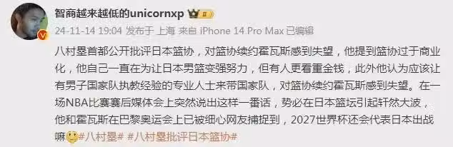 國內媒體人王健解析道,八村塁與霍瓦斯積怨已久,日本籃協也早已知曉,而仍和後者續約到2028年,這很清楚說明了他們選擇站在哪一邊。