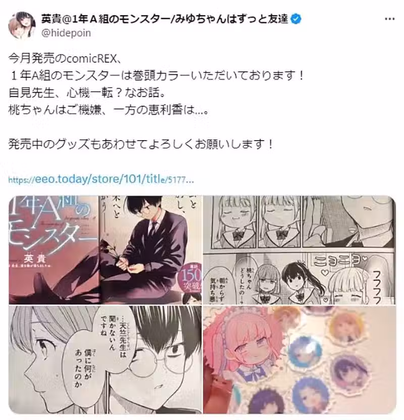 日本漫畫家英貴,最近在X發文宣傳自己於《月刊Comic REX》連載的《1年A班的怪物》這部作品,在最新一期獲得了卷頭彩頁的殊榮!