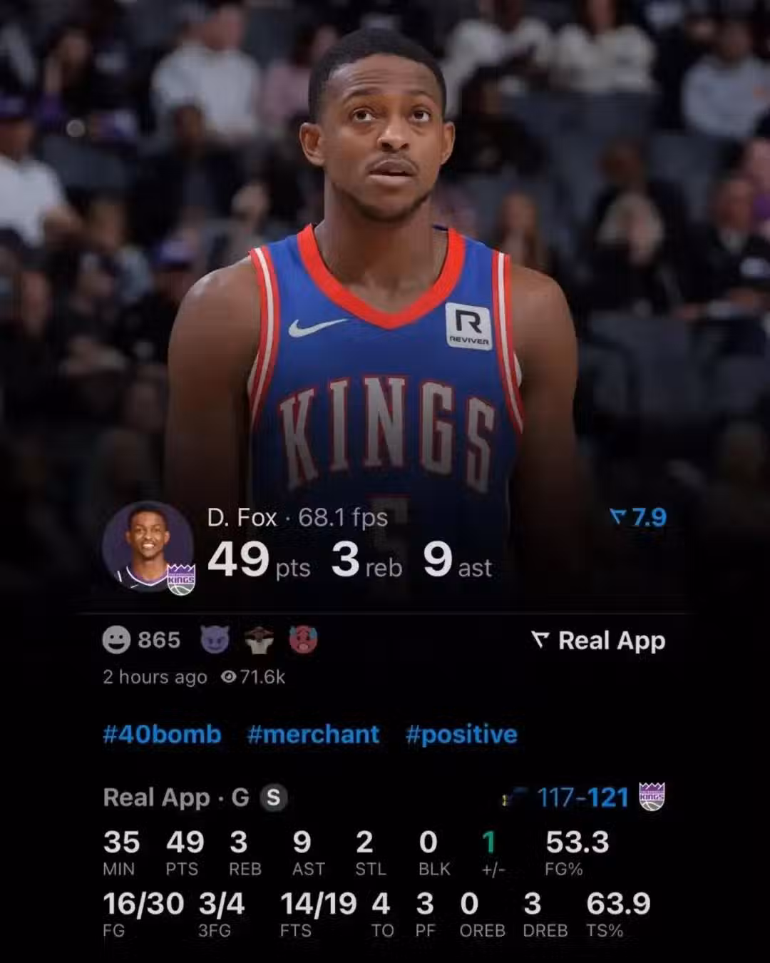 有點可惜的是,這一節福克斯在罰球線上只有8中4,倒數第二次站上罰球線,他更是兩罰全丟——但凡多進一記,福克斯就是背靠背50+了。