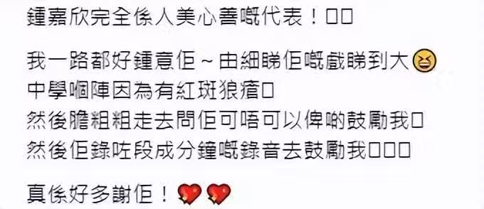該名網民寫道:「鍾嘉欣完全是人美心善的代表!我一直都好喜歡她~從小看她的戲長大,中學那時候因為有紅斑狼瘡,然後壯膽去問她可不可以給點鼓勵給我,然後她錄了段整整一分鐘的錄音去鼓勵我,真的好多謝她!」並上載鍾嘉欣的WhatsApp錄音。
