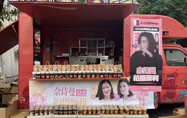 除了在開機現場附近立了很多大型宣傳頁之外,還準備了一輛應援車,車上放了很多咖啡和小吃,供劇組人員享用,這陣仗完全不輸內地流量藝人的應援活動。