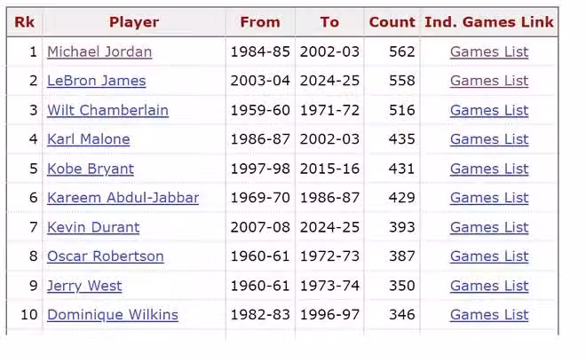 在現役球員中,除詹姆斯外,常規賽砍下30+次數多的球員還有:杜蘭特(393次)、哈登(318次)、庫里(292次)、字母哥(261次),他們和詹姆斯的差距很大,他們應該無法在這個統計上追上詹姆斯了。
