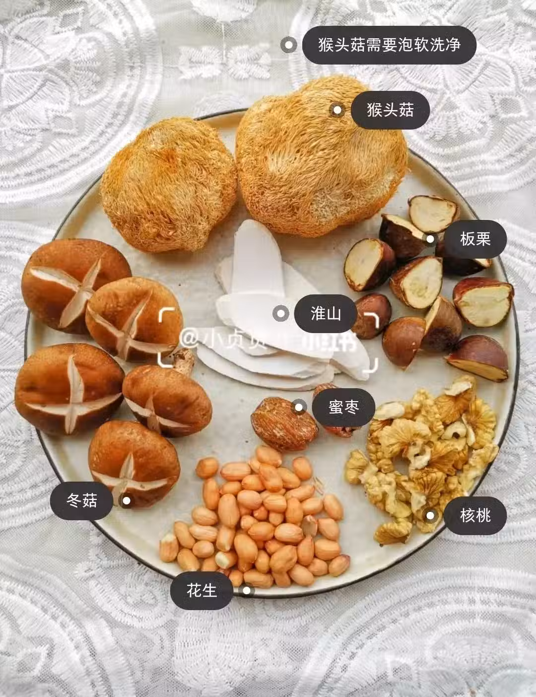 猴頭菇2個,冬菇5個, 淮山50g,花生50g,核桃50g,蜜棗2個,板栗幾個