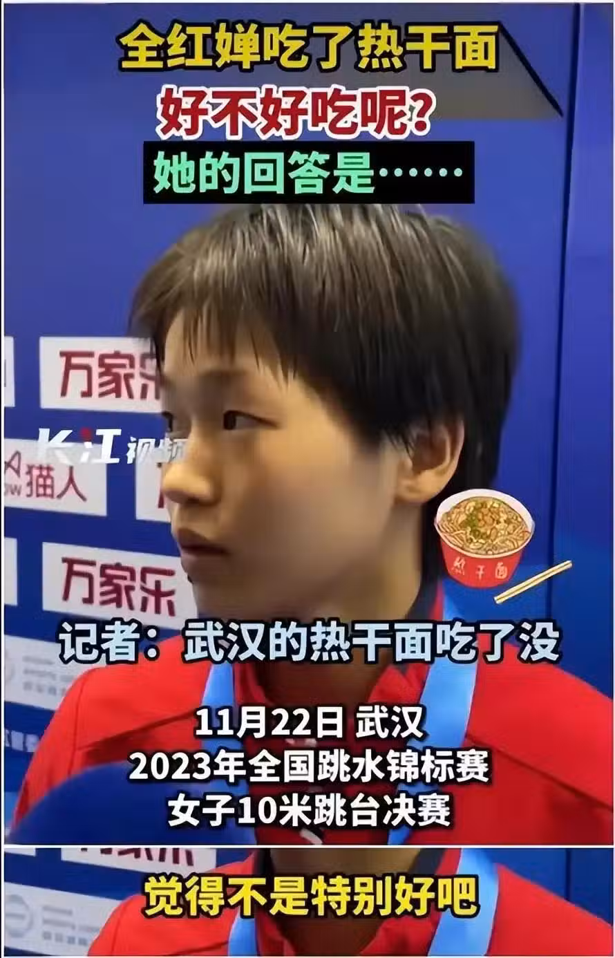 全紅嬋曾在武漢參加比賽時,被記者問及對武漢特色小吃熱乾麵的評價。她直言不諱地表示:「我個人不太喜歡。」這一回答雖然讓採訪場面略顯尷尬,但並未引發當地粉絲的憤怒。相反,他們更喜歡她的真實與坦誠。當地網友也表示,熱乾麵是一種口味獨特的小吃,有人喜歡也有人不喜歡,這是很正常的現象。