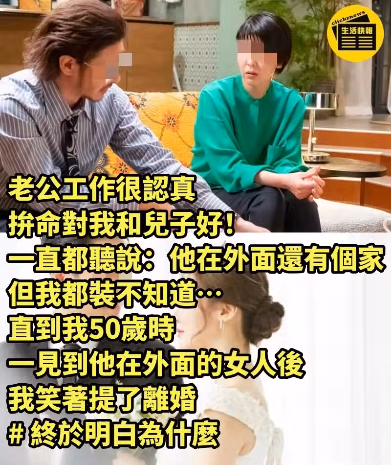老公工作很認真拚命對我和兒子好! 一直都聽說「老公在外面還有個家」,但我都裝不知道…直到我50歲時「一見到他在外面的女人後」我笑著提了失婚 # 終於明白為什麼