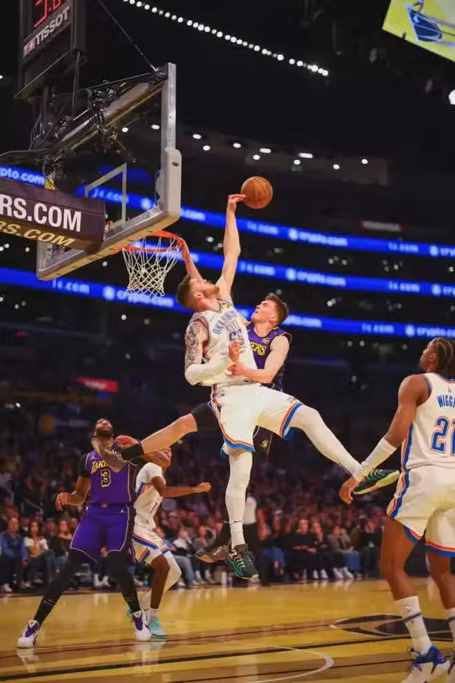 三節打完,湖人69比71落後2分。亞歷山大前三節獨得21分7助攻,文森特緊緊貼防,湖人還嘗試了夾擊,效果不太明顯。末節決戰,拉塞爾兩記三分幫助湖人反超,雷霆立刻三分回應。比賽最後6分鐘,雷霆仍然領先5分。