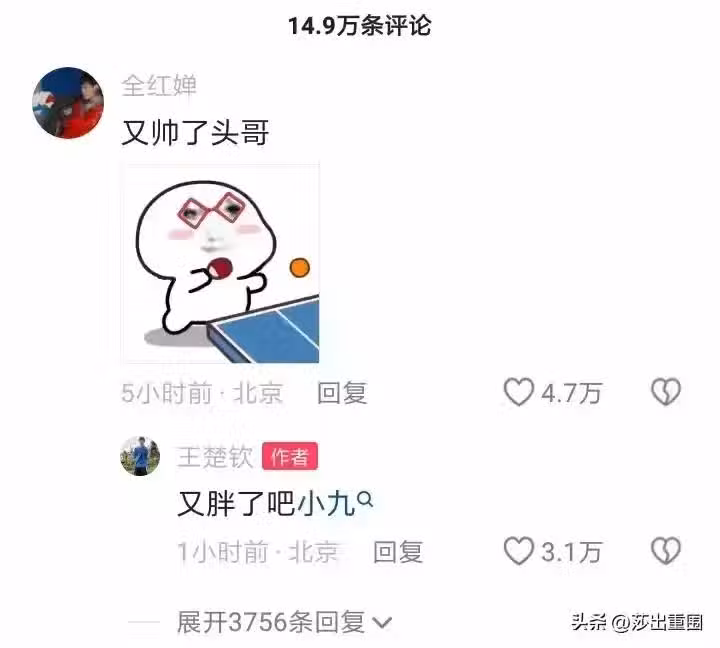 如果說全紅嬋和王楚欽的互動是這場喜劇的「引子」,那麼評論區里的留言就是這場盛宴的「主菜」。網友們紛紛加入這場歡樂的「吐槽大會」,用各種幽默的語言和表情包,為這場跨界喜劇增添了無盡的樂趣。