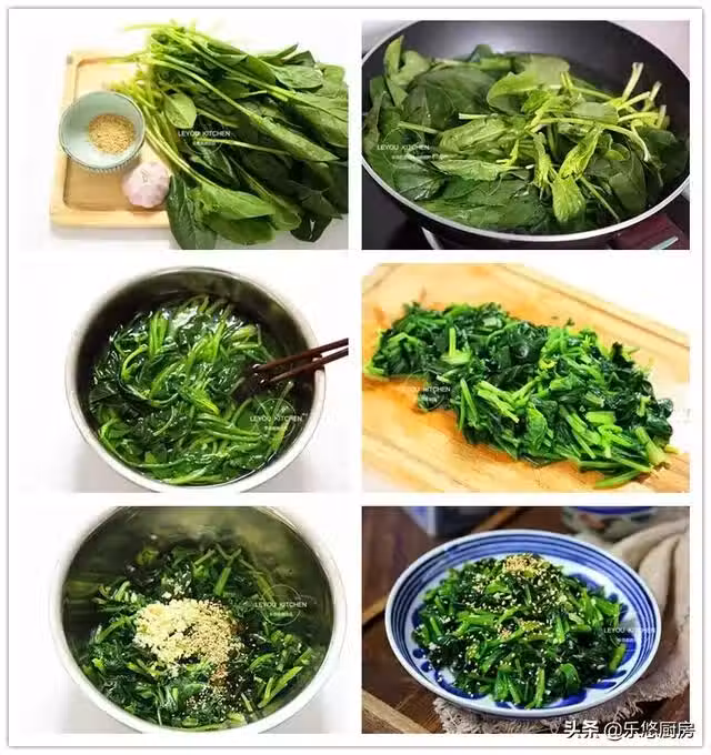 第四步:把菠菜擰乾水分,然後切成段。蒜切末備用。