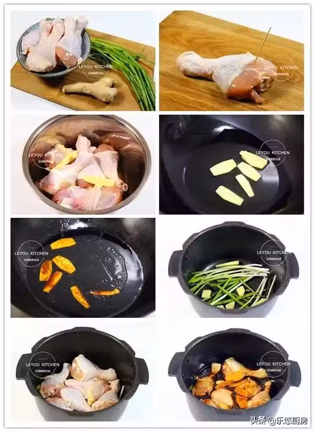 第六步:往電飯鍋底部鋪一些香蔥段和薑片,如圖。(可以把剛才腌雞腿的薑片鋪在鍋底。)