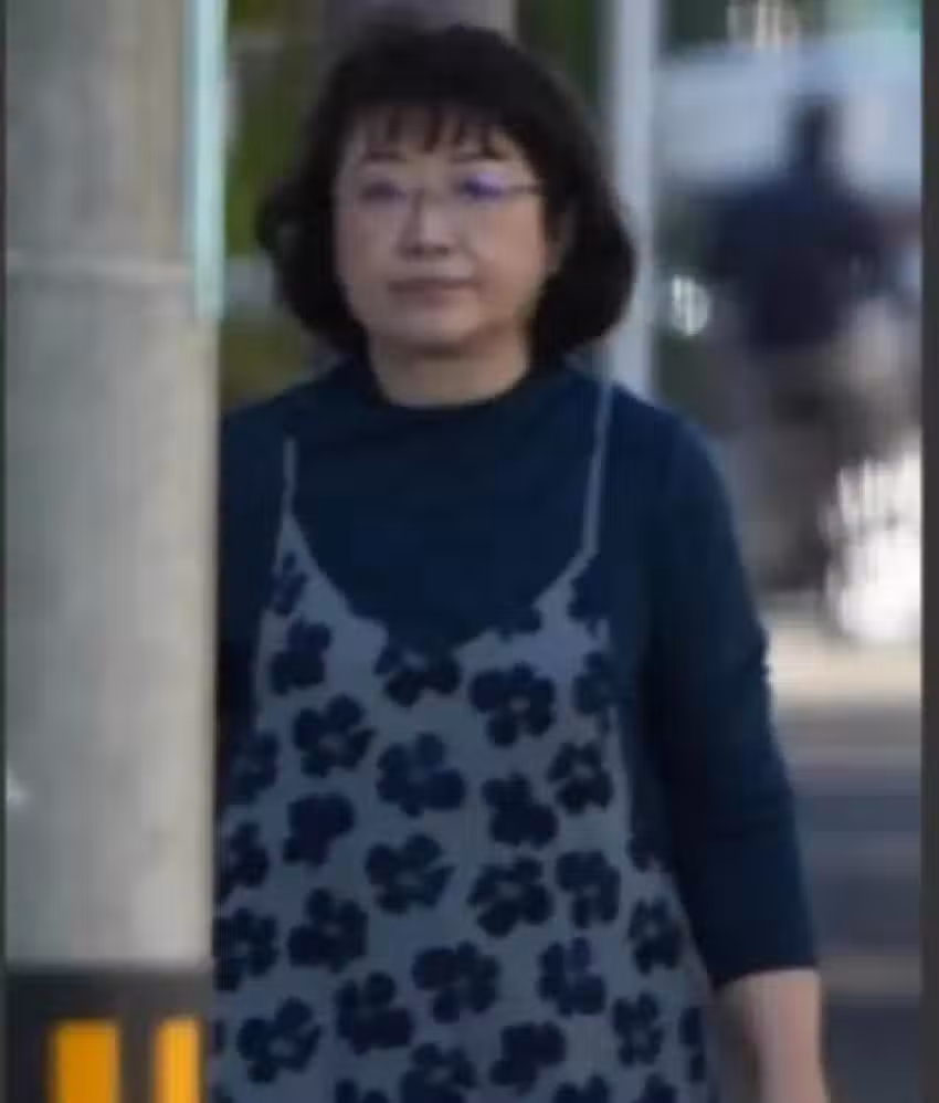 照片中的山口百惠留著簡單的短髮,穿著樸素的花裙子,整個人看起來完全像是一位普通的日本大媽。
