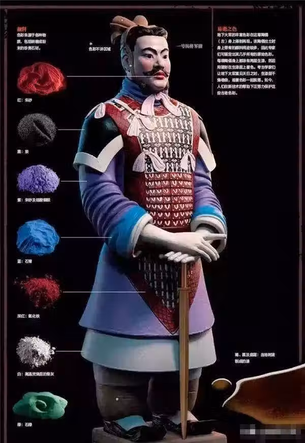 一尊兵馬俑需要上多種顏色,很多的顏色在當時都十分稀有,比如藍紫色,製作這種顏色十分複雜,無法想像在生產力落後的古代,是如何製作藍紫色的?