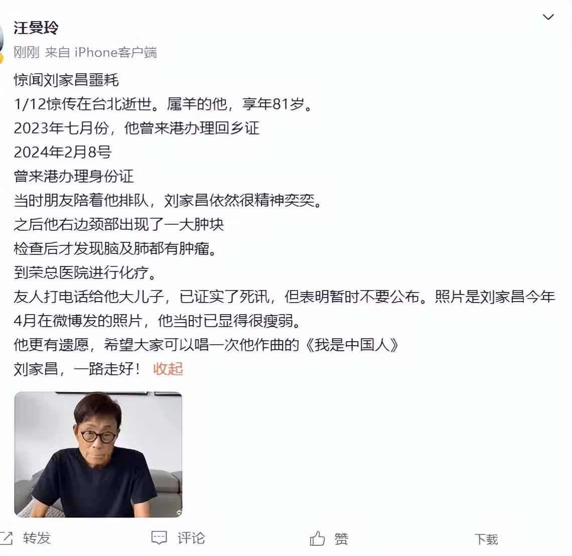 香港媒體人汪曼玲發文透露劉家昌在12月1日去世,指今年2月還很精神,結果在醫院查出腫瘤,回到台灣做了化療,長子希望外界不要公布此消息,還說劉家昌最後心愿是再唱一次《我是中國人》。