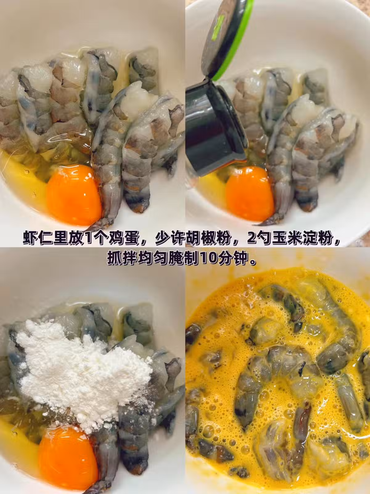 腌蝦仁:蝦仁里放1個雞蛋,少許胡椒粉,2勺玉米澱粉,抓拌均勻腌制10分鐘。
