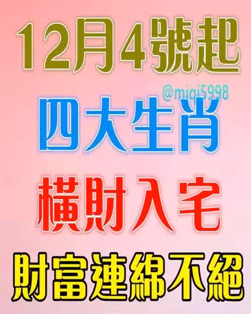 嘿,各位小夥伴們,快醒醒,睜大眼睛瞧好了,接下來的消息絕對讓你們心跳加速,喜上眉梢!從12月4日起,宇宙的星盤似乎特別偏愛幾位生肖寶寶,準備好了嗎?這四大生肖即將迎來一波橫財入宅、愛情花開的超級運勢大爆炸,簡直就是坐著火箭直衝幸福雲端的節奏啊!
