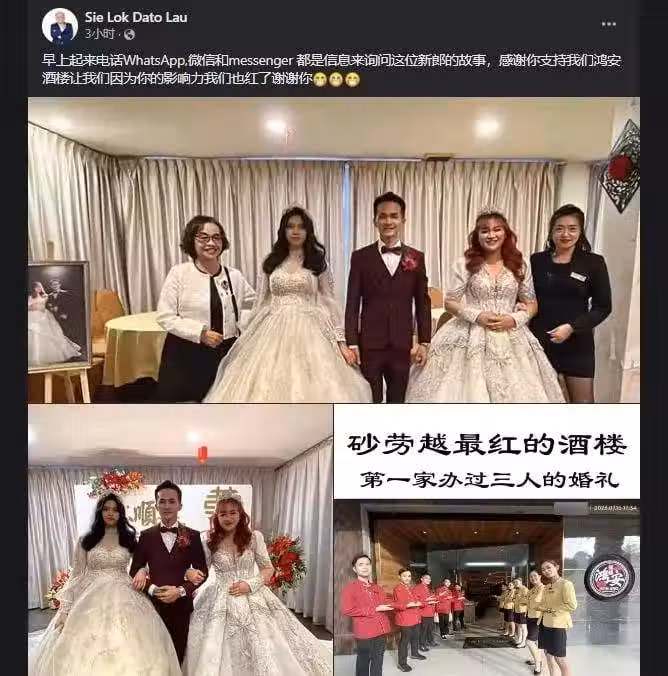 他們大打廣告,一早便在面子書專頁上發帖,自稱「砂拉越最紅的酒樓,第一家辦過三人的婚禮」。