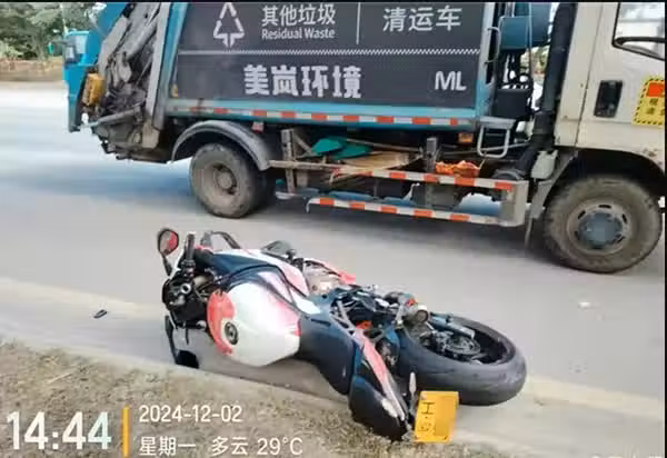 萬小橘的摩托車就摔倒在路邊,旁邊停著一輛垃圾清運車,不知道萬小橘是不是撞到了這輛車。