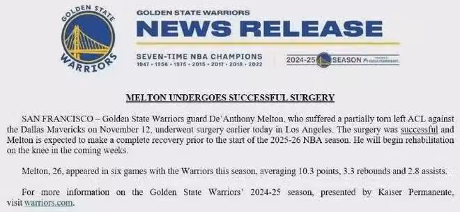 勇士官方宣布:梅爾頓成功接受左膝十字韌帶部分撕裂手術,預計將在25-26賽季開始之前完全康復,同時意味著正式確認前者本賽季報銷。