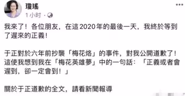 在這2020年的最後一天,我終於等到了遲來的正義,於正當初的抄襲,是對我的打擊,如今的道歉,卻是我2021年的新年禮物,知錯能改,善莫大焉。