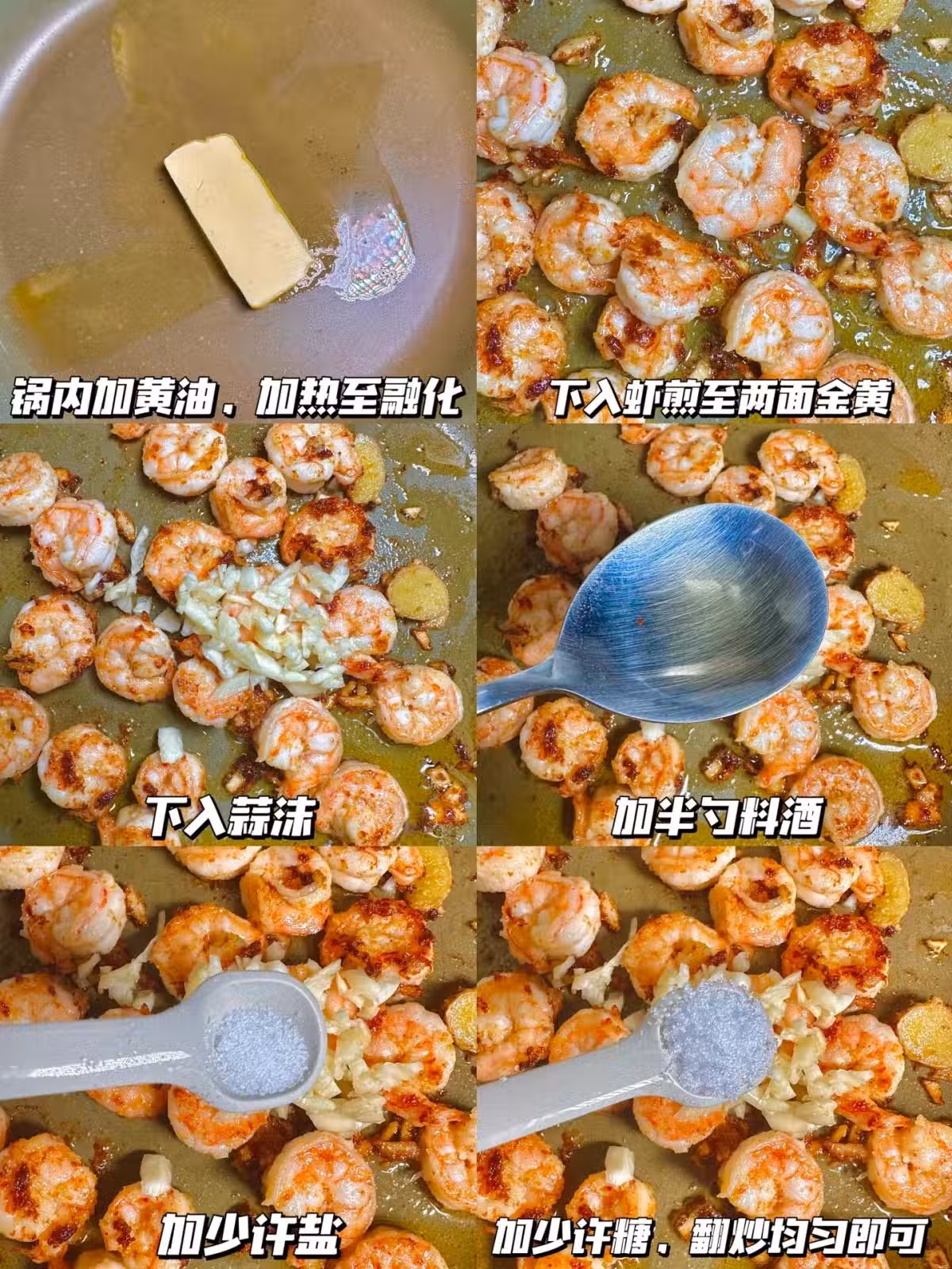 3⃣️鍋內加黃油,下腌好的蝦兩面煎至金黃,然後下去蒜沫➕半勺料酒➕一點點🤏鹽➕一點點🤏糖,翻炒均勻出鍋!
