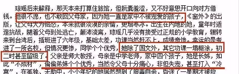 作為家中長女,少年時的瓊瑤因為「不成材」,很是不得父母的喜歡。