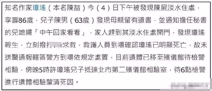 據報道,瓊瑤過世當天是兒子發現了瓊瑤留下的遺囑,就讓妻子回家查看。