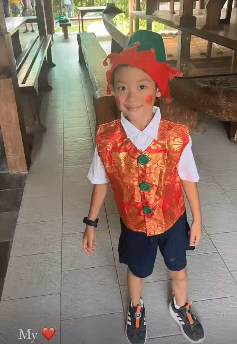 Hunter一身小丑打扮,他身穿白色polo恤襯橙色馬甲,戴上一頂紅、綠色的小丑帽,臉上塗了兩個紅色圓形,造型極之可愛,他與一群同學在操場上表演,樂基兒則在觀眾席上為兒子拍視頻留念。
