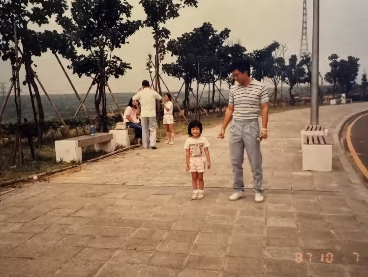 這張照片是陳妍希9歲的時候,那麼大了還要爸爸抱起來拍照,父女倆一起比著剪刀手,笑容燦爛。