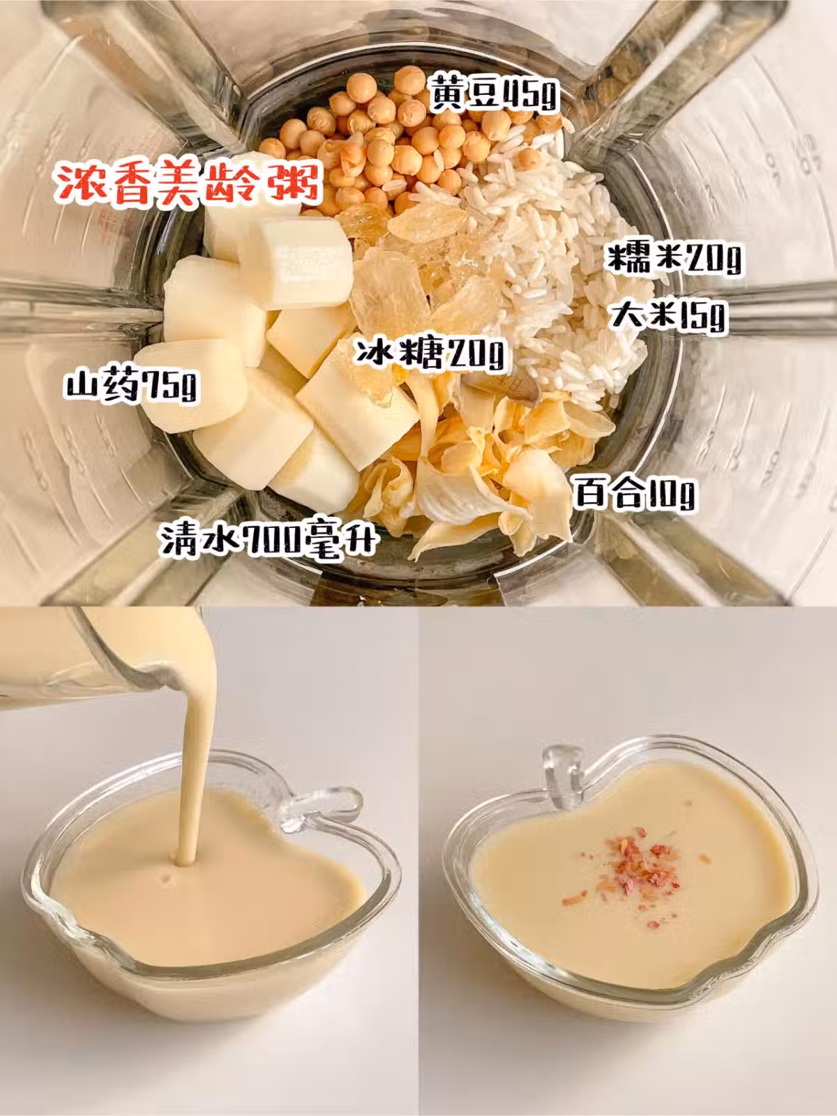 🥤濃香美齡粥 山藥75g|大米15g|糯米20g|黃豆45g|百合10g|冰糖20g|清水700毫升|玫瑰花(裝飾用) ◆宋美齡夫人zui愛的美容養顏粥,據說喝一碗抵過100張面膜。這個配比直接封.神!是我喝過zui好喝的,口感濃稠度剛剛好,我要喝一輩子 ! .