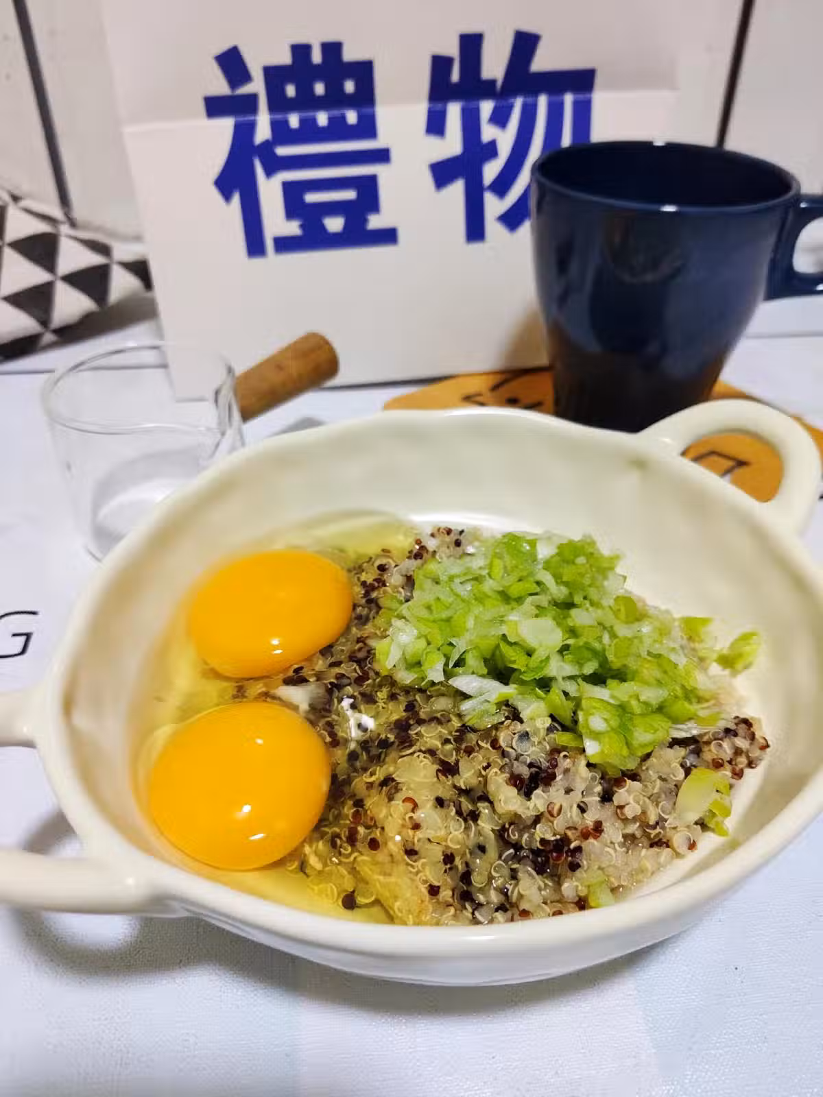 藜麥50g,雞蛋2個,蔥花適量,海鹽黑胡椒適量