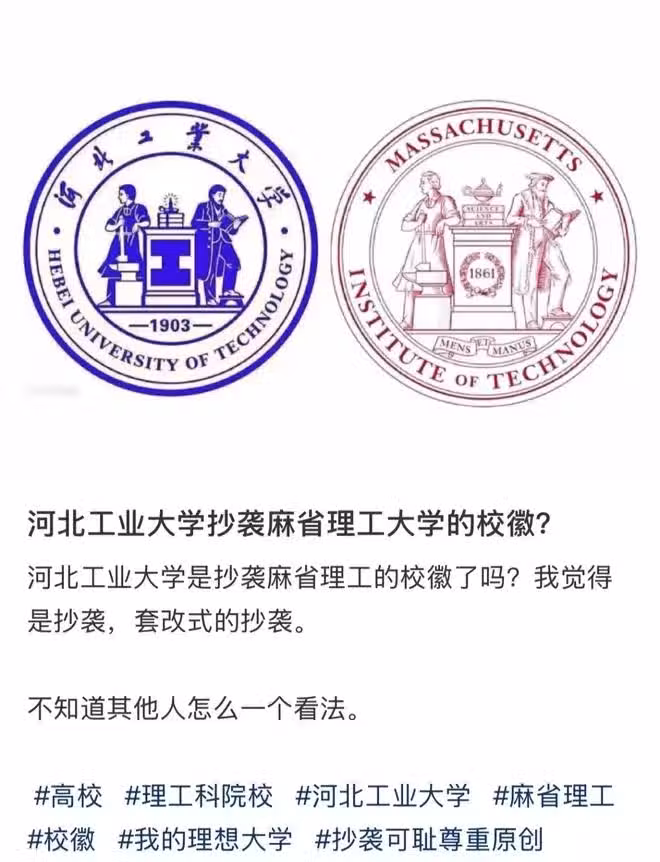 日前,有網友對比河北工業大學與麻省理工學院的校徽,發現二者驚人相似,於是質疑:河北工大是不是抄襲了麻省理工?