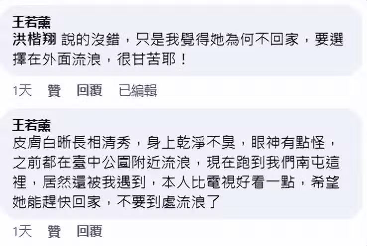 王若薰表示,林靖恩之前在台中公園附近流浪,現在跑到南屯這裡,希望她趕緊回家,又表示林靖恩長得眉清目秀皮膚白皙,身上乾淨不臭,只是眼神有點怪。