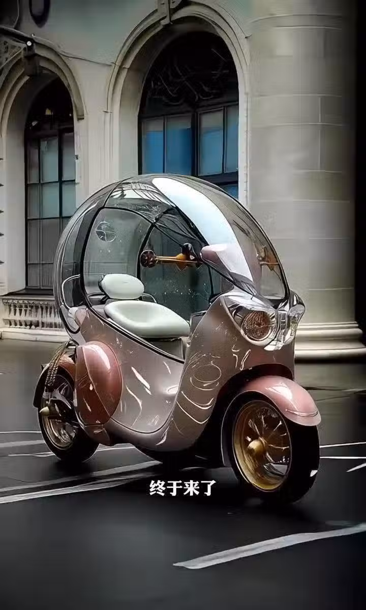 新一代三輪摩托車,外觀設計獨特,可自動伸縮,全透明車體遮風擋雨,前輪自平衡怎麼騎都不倒