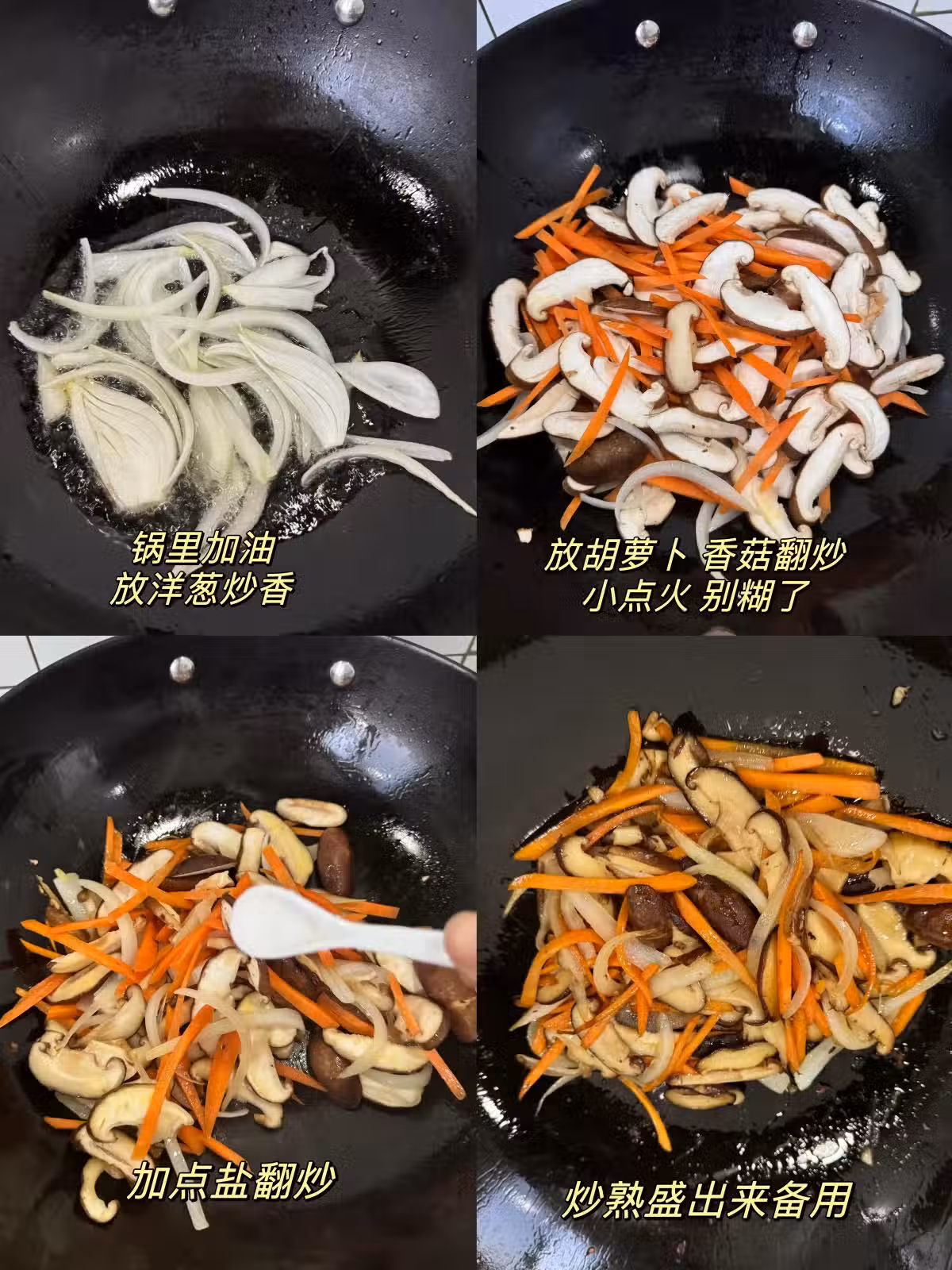 1️⃣鍋里加油,放洋蔥炒香,放胡蘿蔔和香菇小火炒,加點鹽,炒熟盛出來備用